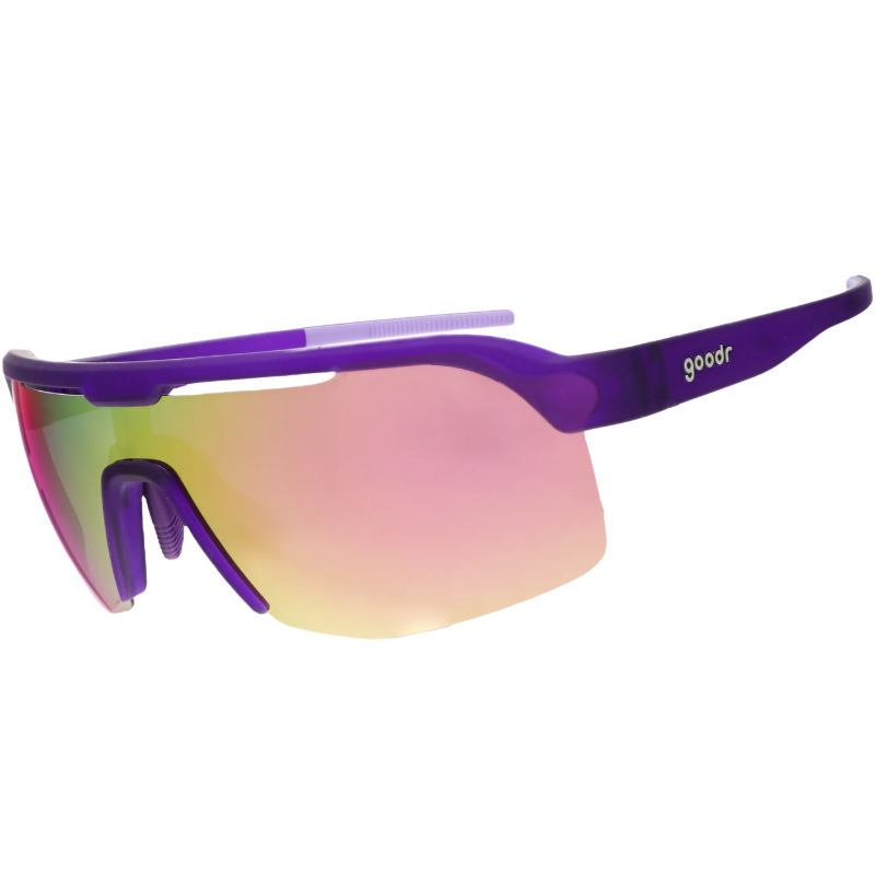 TAG, you're IT in these purple shield sunglasses w/ half-rim frames & light pink reflective lenses. Channel your inner cephalopod's athletic abilities in these baddies. (Get real, does having eight arms give you an unfair advantage when playing tag?)